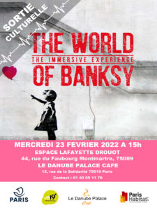 Sortie culturelle, Mercredi 23 février 2022 à 15h "BANSKY" à "L'espace Lafayette Drouot" 44, rue du faubourg Montmartre, 75009 Paris. 20 places disponibles pour une sortie en groupe entièrement financée par l’association. Rendez-vous fixé sur le lieu de la sortie (transport non...