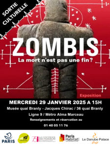 Sortie culturelle Mercredi 29 janvier 2025 à 15h / avec l’exposition « Zombie » au musée du quai Branly – Jacques Chirac 37 quai Branly 75007 Paris. Infos pratiques : Mercredi 29 janvier 2025 à 15h / Ligne 9 / Métro Alma Marceau